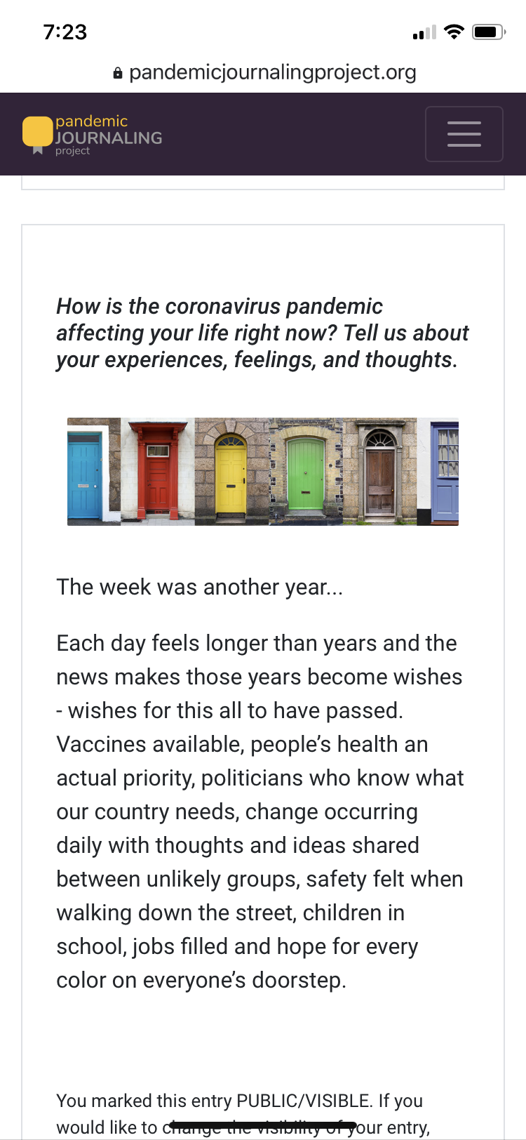 The premise of UCONN’s Pandemic Journaling Project is to record, in real time, our experiences, thoughts and feelings about this time in our lives. Options are writing, posting a photo or audio to answer questions posed on a weekly basis. This was my entry for this week which is featured on the site.